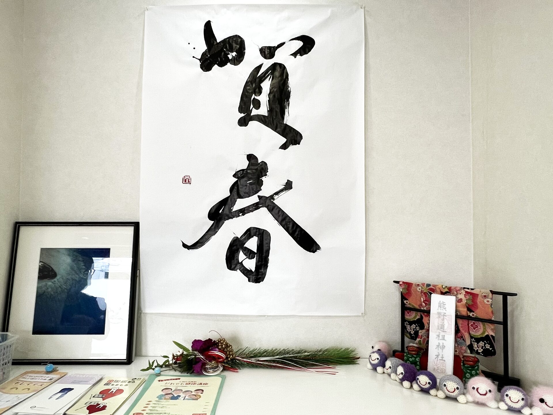 パンフレットなどの他に患者様から頂いたお人形や書初めなどの品物を飾っています。